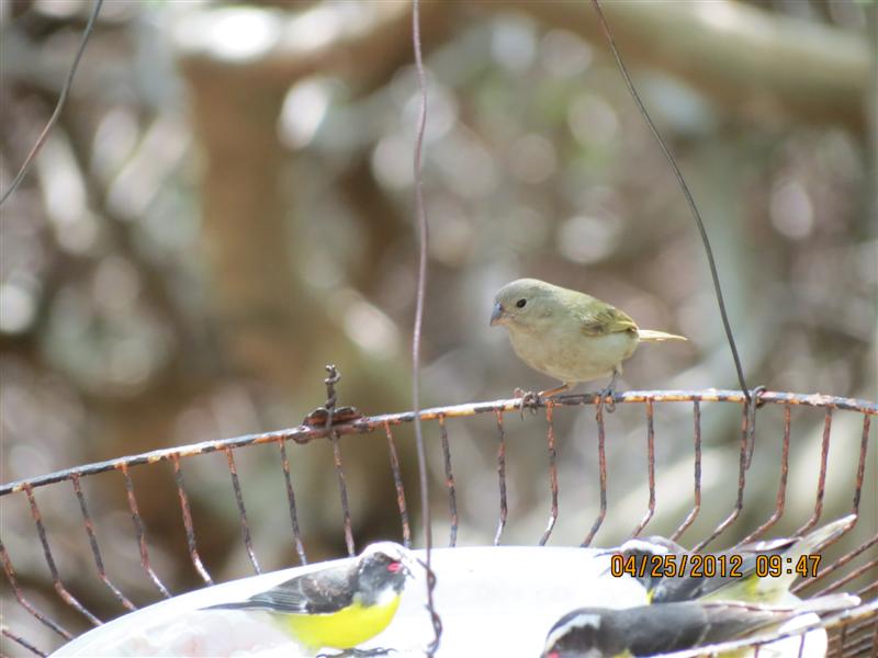 I was happy to be able to see both the male and female. Above the female is perched on the sugar feeder with the Bananaquits. I know professional photographers prefer to take photos of the birds in more natural surroundings. But, being a birder I am into seeing a new bird where ever it maybe... even on the feeders.