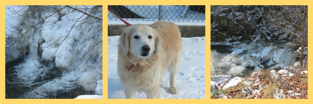 Bob and I went on an outing yesterday. It was good to see the sunshine and blue skies, although it was still a chilly day. It felt good to get some fresh air! Your mosaic is nicely done; love the photograph of the hanging ice. I always enjoy photographs of Goldie and your birds.