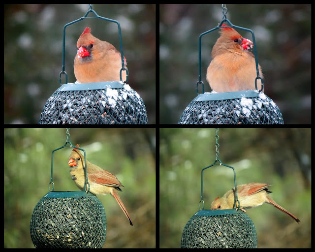 Good shots of the cardinals; the squirrels would have a hey day with that feeder in my yard.