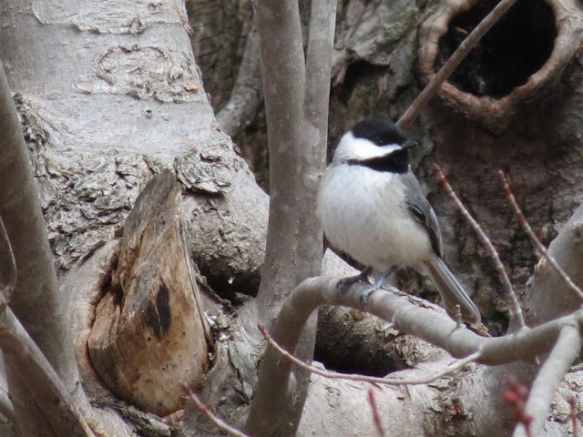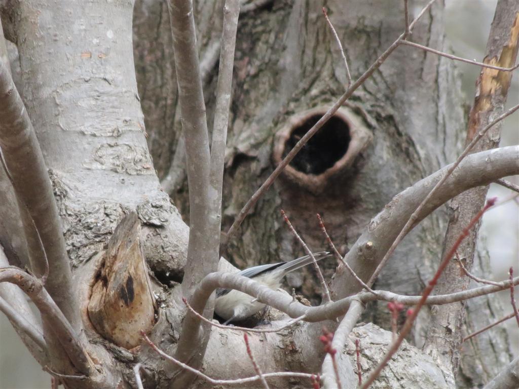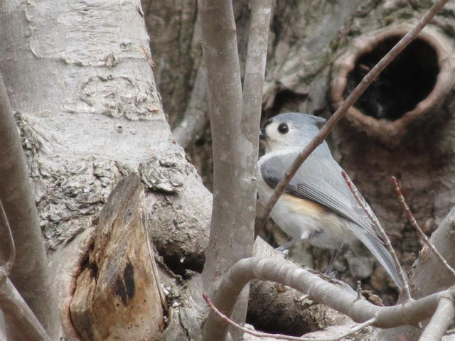 Yesterday, I watched both the Carolina Chickadee and the Tufted Titmouse going back and forth to this tree. There is a hole there, I am not sure if they have a stash of seed there?