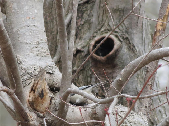 Maybe they are stealing the squirrels stash of food? Above the Chickadee is going down into the hole.