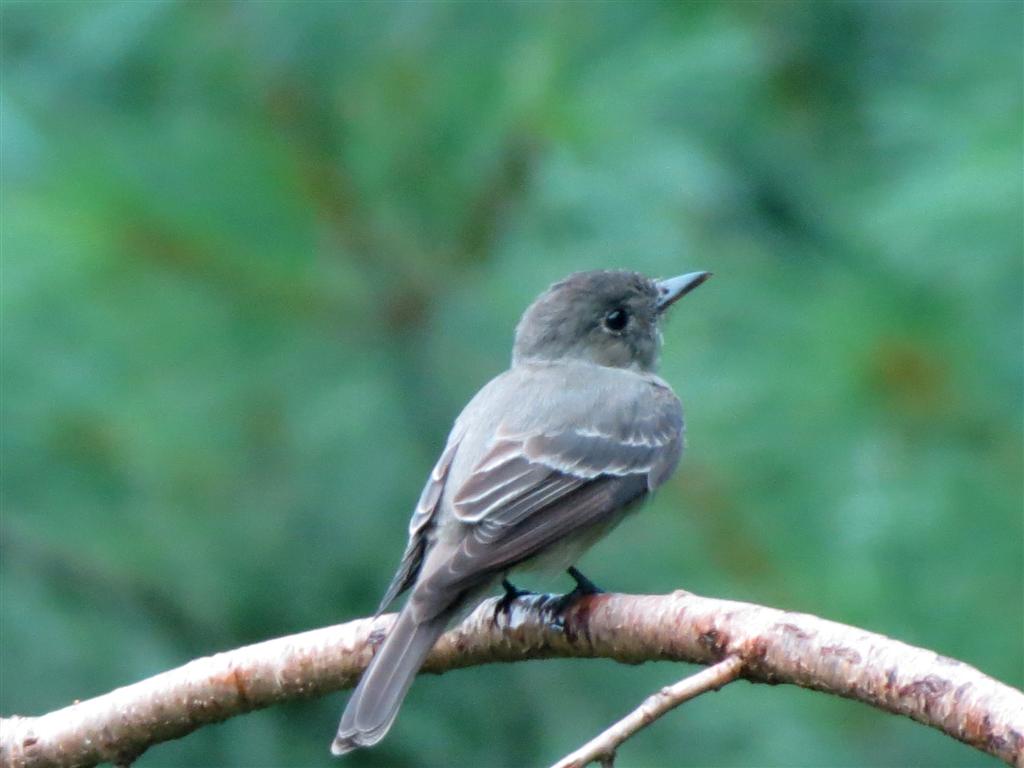 I am pretty sure this is a Eastern Wood Pewee in the flycatcher family. I have been hearing one nearby our yard, their song a rising... peeeaWEEE, it sounds almost like they are saying their own name.