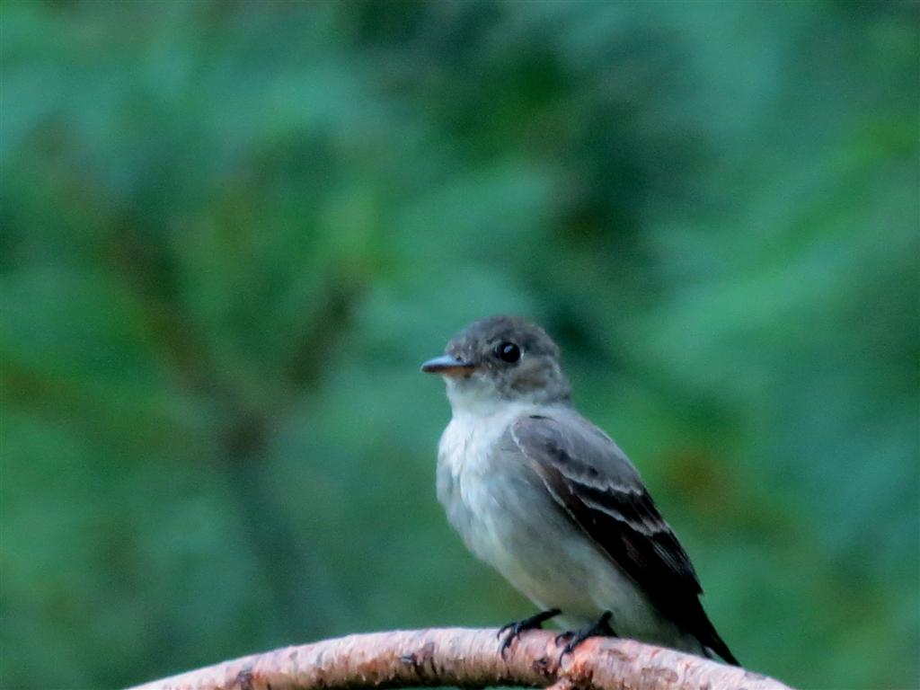 According the field guide the Pewee has a dark head and a partial eye ring.