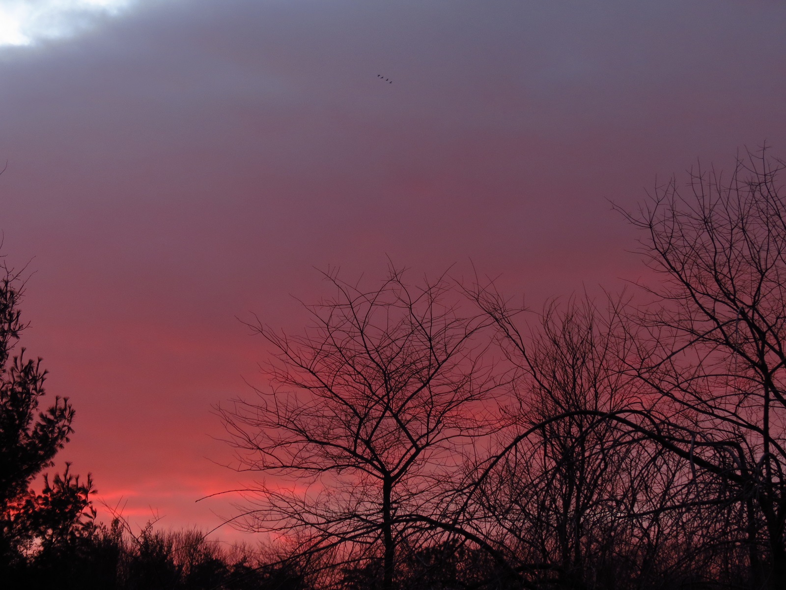 One evening we had some colorful skies, I ran out and took a few shots from the driveway. I see four birds way high up in the sky, maybe four geese?