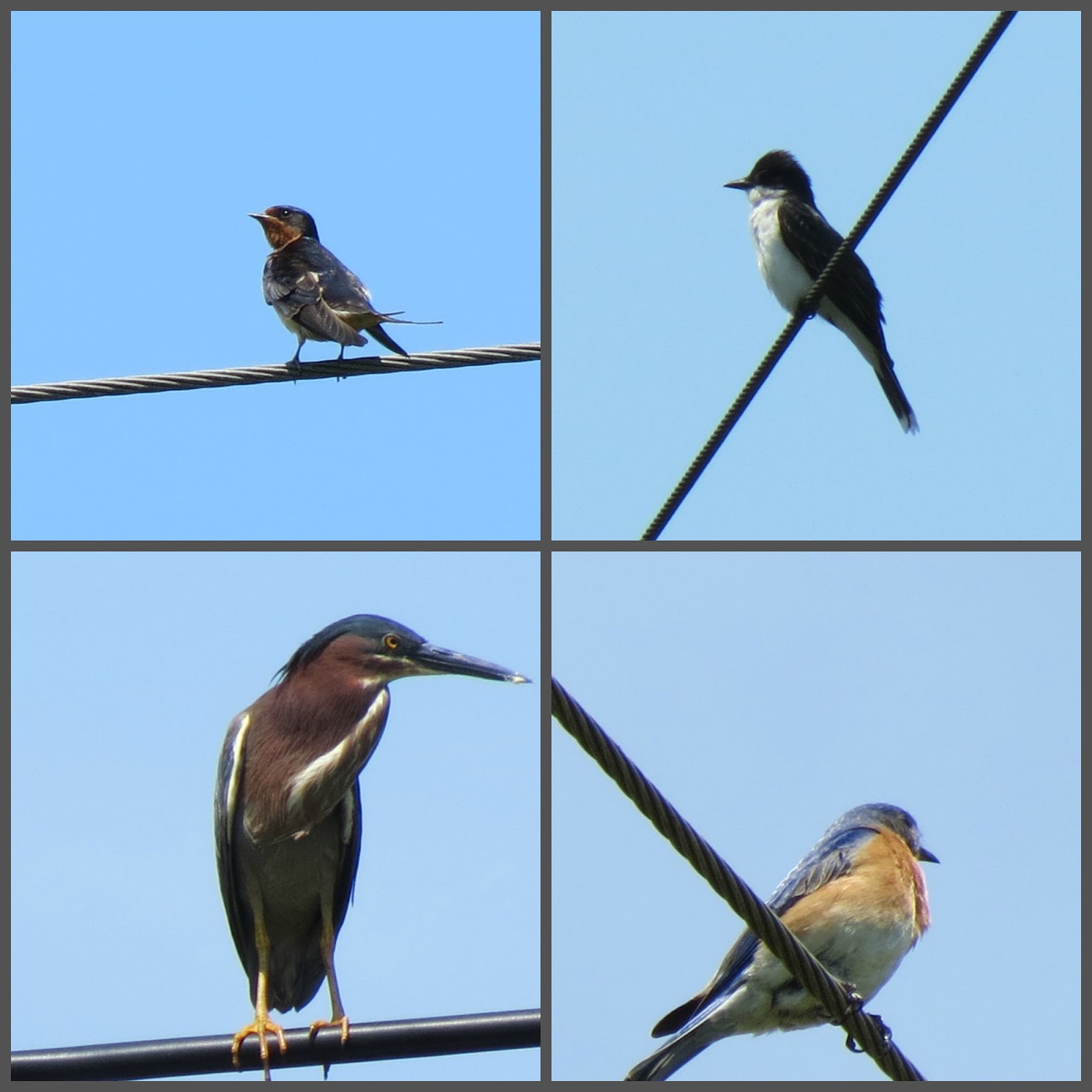 Above some of the birds we saw top line the Barn Swallow and an Eastern Kingbird. The bottom row the Green Heron and an Eastern Bluebird. They all posed nicely on the wire that runs across the lake.