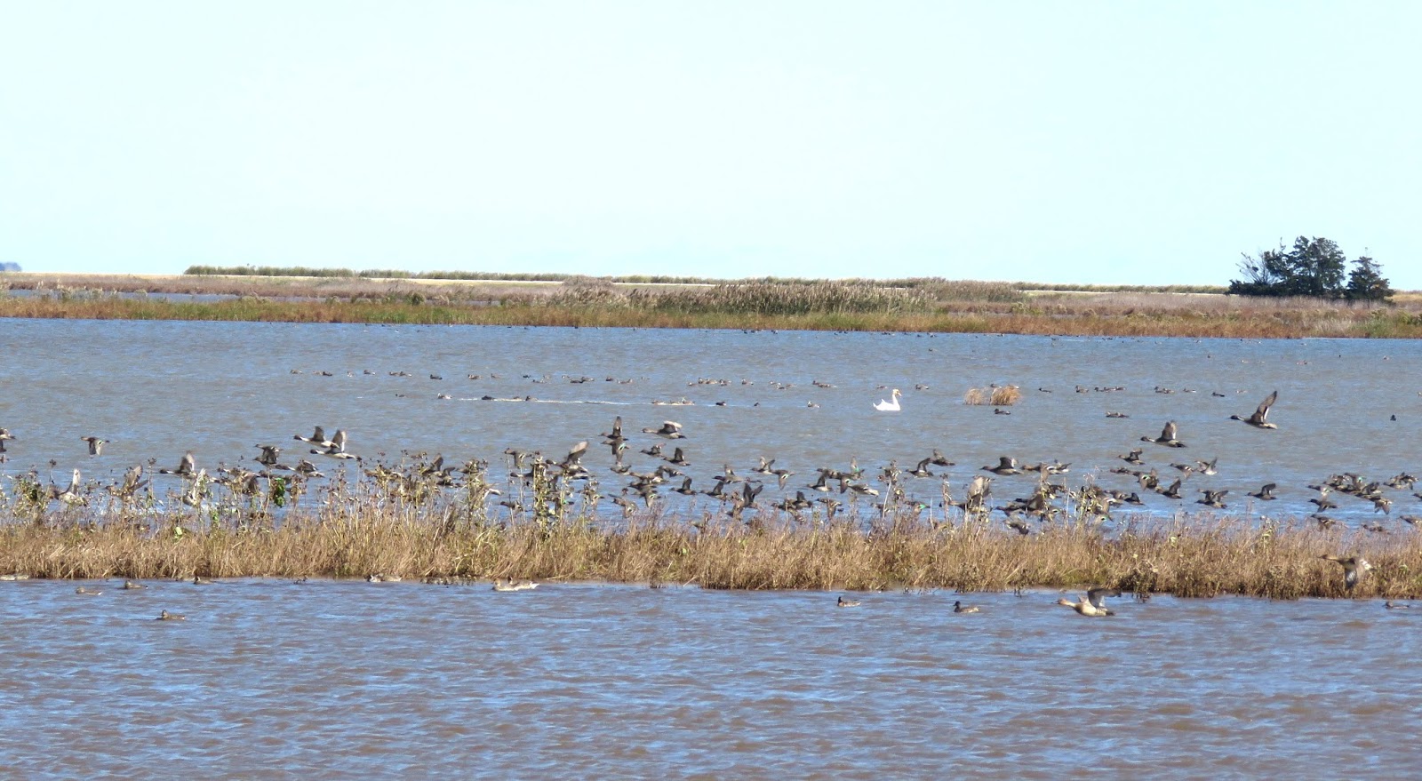The Northern Harrier was flying by and shaking up the ducks, every once in awhile the ducks would fly up and around and then land again. The phragmites an invasion plant and common weed seems to be all over the refuge, they have been cut in some places along the drive.