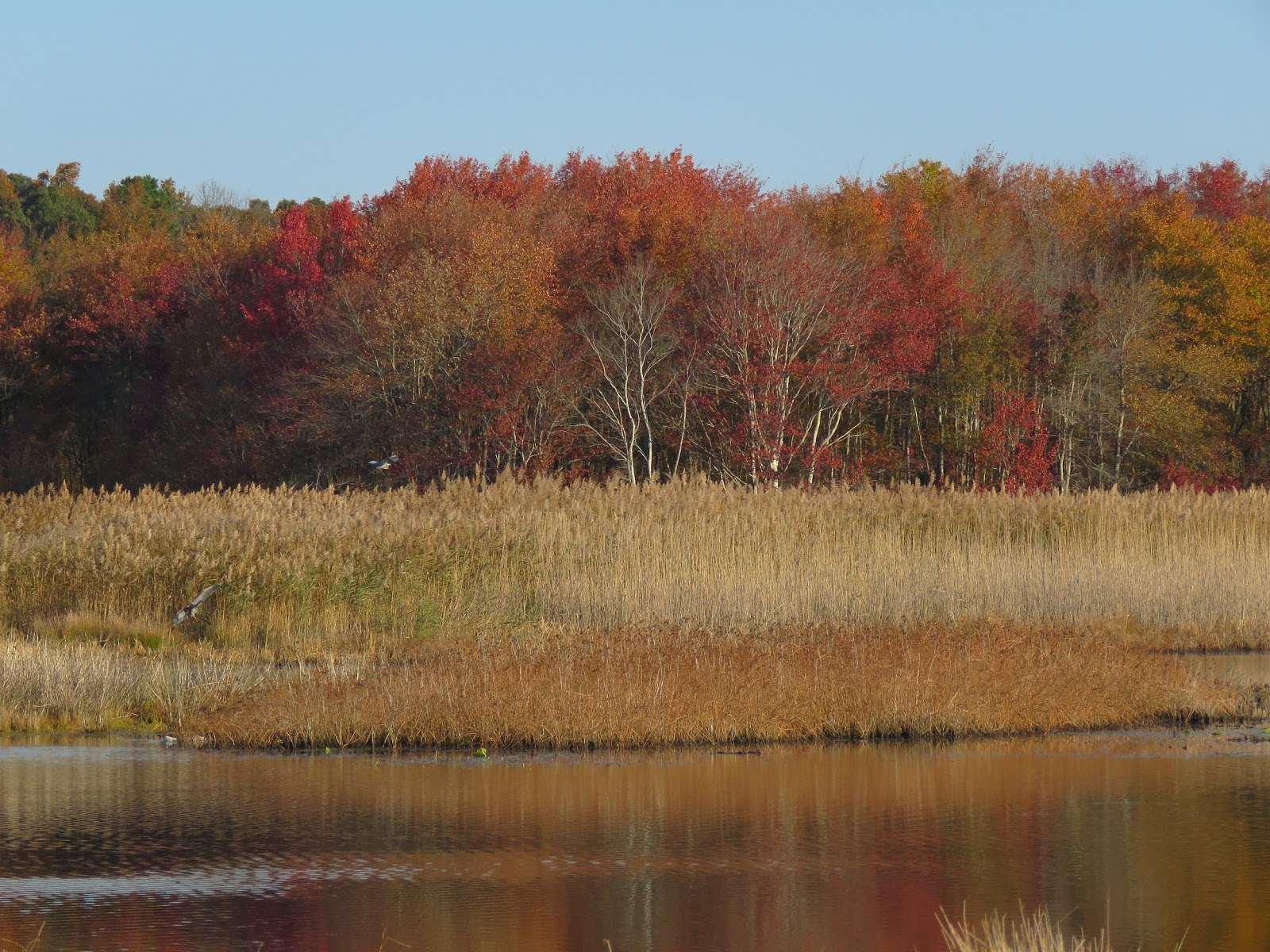 You really have to look for the 2 Great Blue Herons chasing each other in this photo below. The tree colors are beautiful.