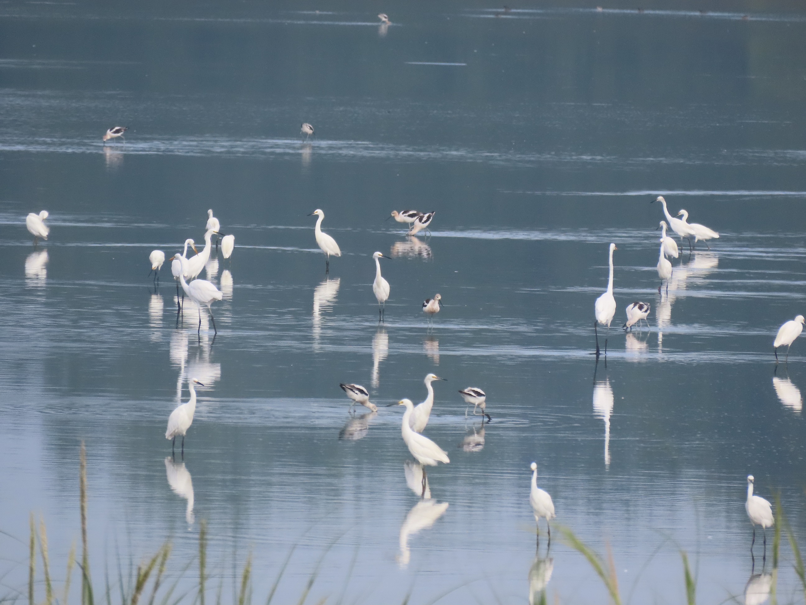 1. I love seeing the large groups of Snowy Egrets and the Great Egrets, we also saw a Tricolored Heron hanging out with the Great Egrets and a few Green Herons. The American Goldfinch was eating some seeds off a nearby plant, American Avocets look busy grooming themselves, a Common Moorhen was hidden in the wetland grasses. In the last row, I was undecided if I was seeing the Purple Martins or Swallows, someone listed Bank Swallows on ebird for this sight. A pair of Bald Eagles were seen off in the distance near their nest and last are more Egrets with a Glossy Ibis.