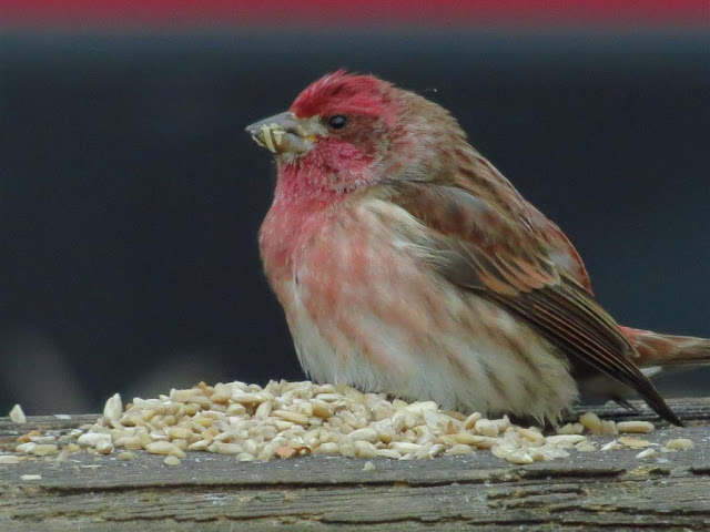 The female Rose Brested Grosbeak was just passing thru to her nesting habitat. She decided she needed a quick fix of bird seed to keep her going.