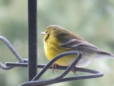The American Goldfinches are here year round but the males turn a duller color in the winter. They look beautiful in the summer.