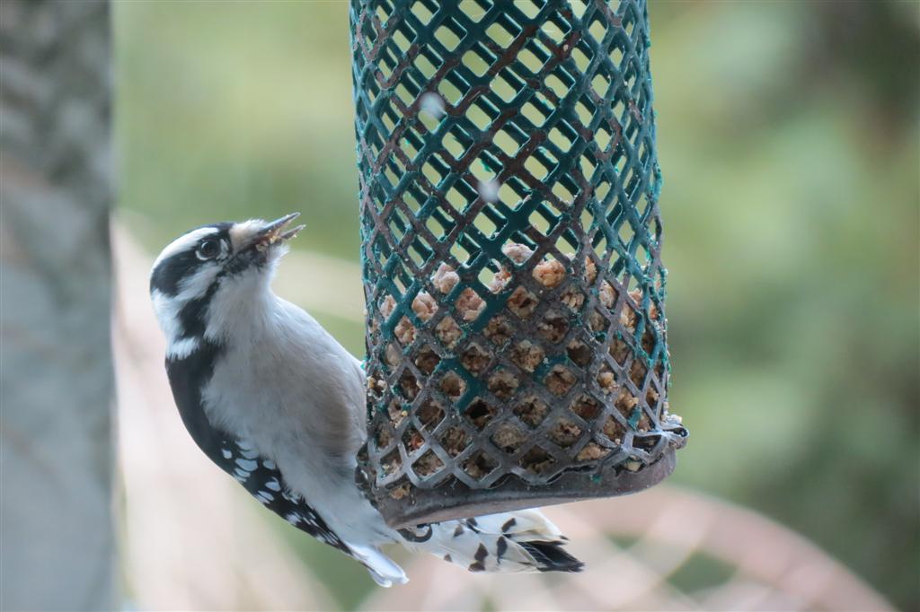 This is a shot taken from my dining room window, a pretty female Downy Woodpecker.