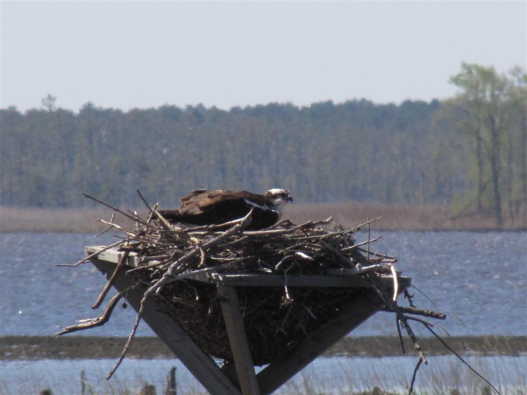 The Osprey are great birds to see, they are dark brown above and white below, they have a dark eye stripe. Their huge stick nest are conspicuous on bouys, channel markers and large trees. The Blackwater refuge has nesting places set aside for the Osprey. They hunt by hovering over the water and then plunging down to graps the fish with their open talons.