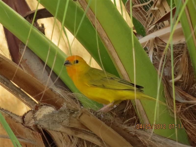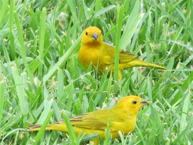 I am showing off my pretty Saffron Finches that I saw in Curacao. The Saffron Finch is a Tanager from South America. Of course they are seen in the Netherland Antilles. The male is bright yellow with an orange crown and the females are a slightly duller version of the male. They prefer live food like insects but I have seen them at feeders.