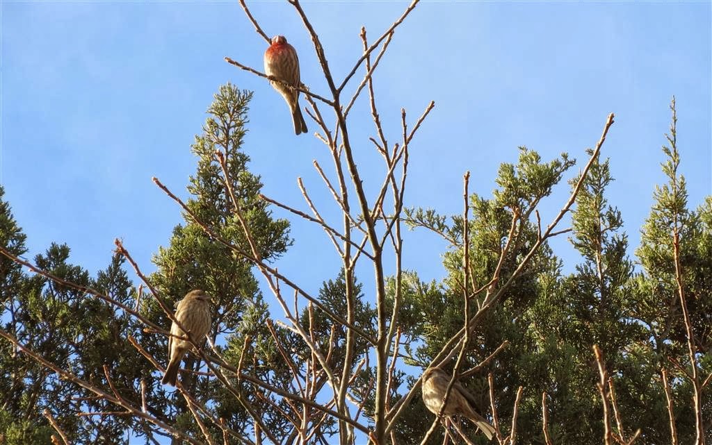 The House Finches perched in a tree near the nature center's feeders.