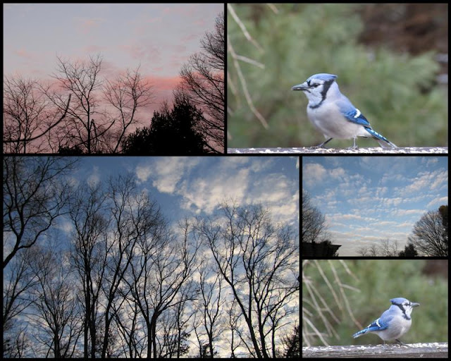 In the mosaic above is my sunrise, a couple of Bluejays on my deck and the pretty sky and trees around my house.