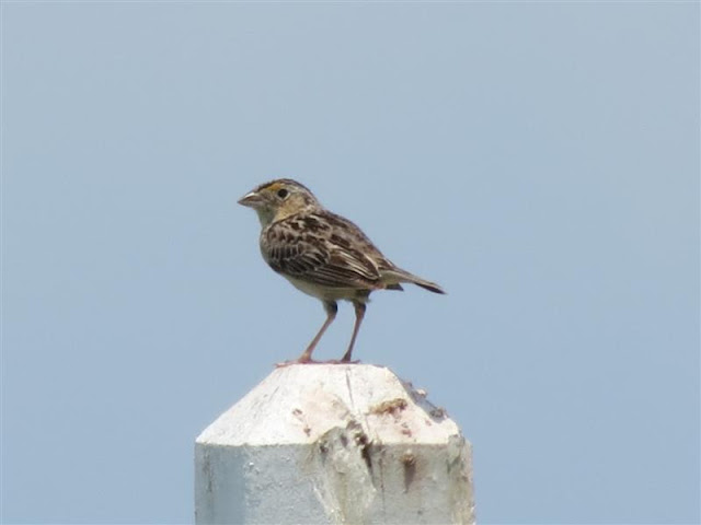 I posted my bird or what I thought was my female Dickcissel on my facebook page so members of my bird club could see.. when they informed my second bird was a Grasshopper Sparrow. The Grasshopper Sparrow has a pale white central crown stripe, yellow lores, white eye ring, heavy bill and a chunky body. Cool..lifer number two..I was happy with my sightings, my next back road bird will be a Bobolink maybe during the fall migration?