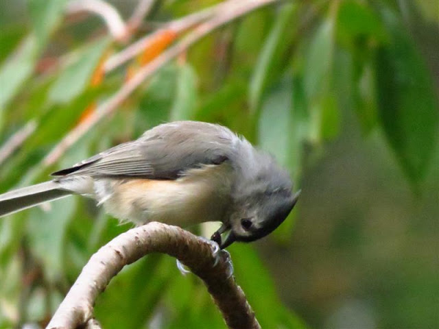 The Titmouse likes to pick apart the sunflower seed while perched on my Weeping Cherry tree.
