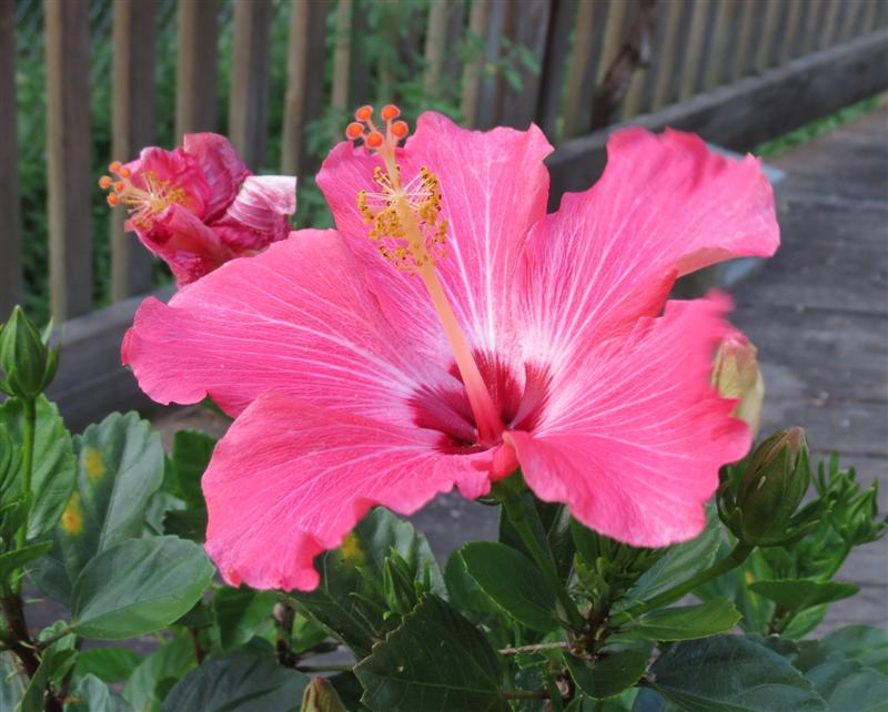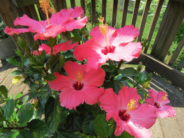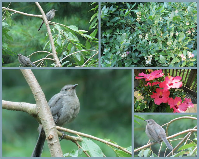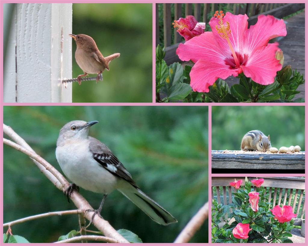Today I am posting some more scenes from around my yard. My backyard birds are always around for some photo opportunities. I took a shot showing that most of the trees across from my driveway are all still green, only a few have some Autumn colors. On my deck I have some Salvia trying to hold on, the hummingbird just loves this plant and I have a couple of blooms on my hibiscus plant. The purple stems and berries on the Pokeberry bush look pretty while the birds pose for me.