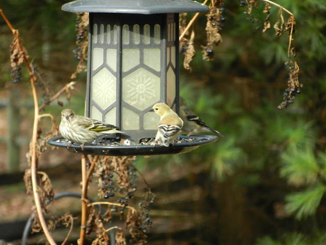A Pine Siskin and a couple of my Goldfinches.