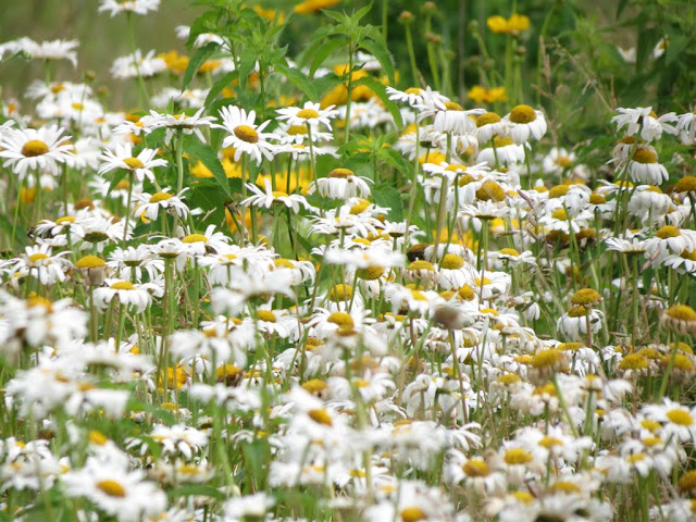 The trail comes out of the woods to this open field, lots of wildflowers, a pretty sky. Just a gorgeous day for a walk.
