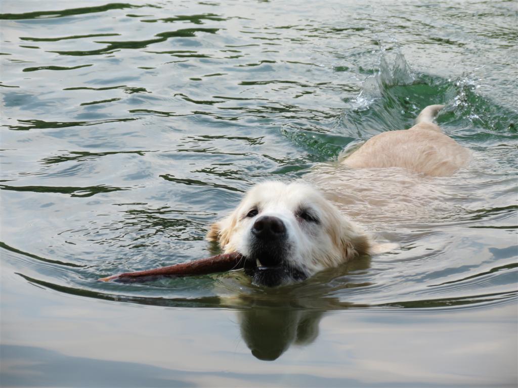 This may be a snapping turtle swimming in the lake. It looks kind of big.