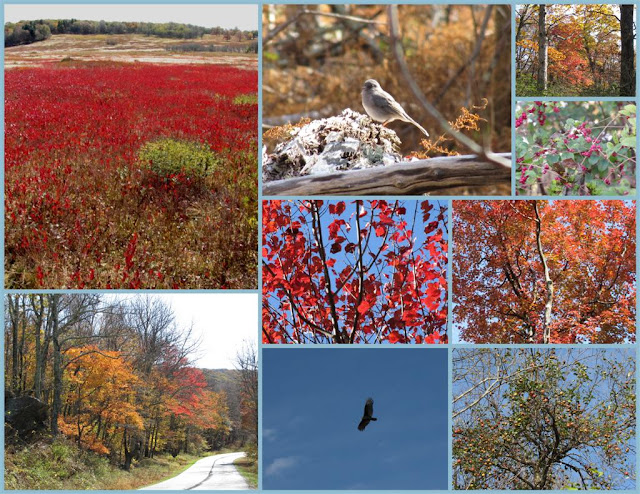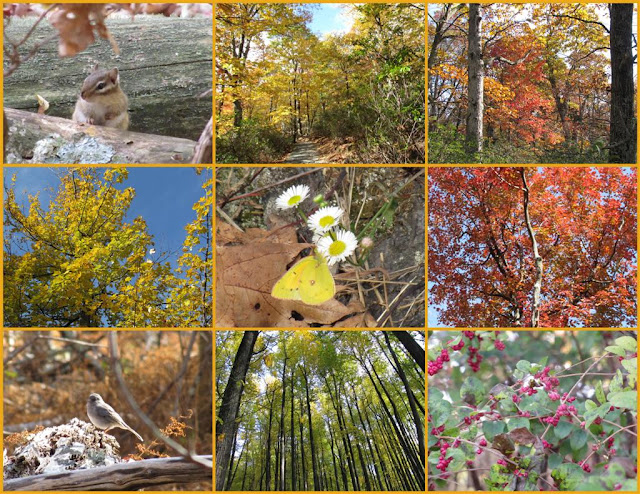 I am linking my post up with Mosaic Monday & Our World Tuesday & Ruby Tuesday. This post is on my our visit to Shenandoah last weekend. Hubby and I love to drive along the Skyline Drive. The colors were beautiful, not the best we ever saw but they were still very pretty. Of course when we visit Shenandoah National Park we take a hike on my favorite trail the Limberlost Trail. It has been a great trail to see birds up close. This time we saw three wild turkeys. Also, we heard lots of RedBellied woodies, Pileated woodies, Towhees, Titmouse, Juncos, both Golden and Ruby Kinglets, Bluejays, Cardinals and Wrens. We saw many vultures and black birds in flight along with one unknown hawk.