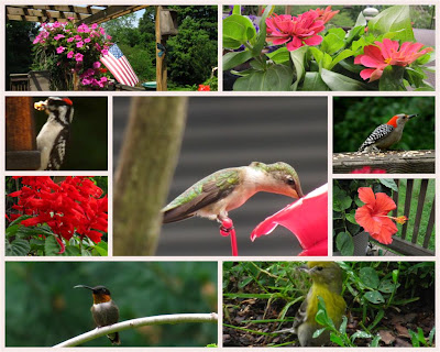 This past weekend I have been enjoying my backyard birds and all the pretty flowers in my yard and on my deck. I am joining in on Mary's Mosaic Monday with my mosaics and Mellow Yellow Monday with my yellow birds and lilies and Mary the Teach's Ruby Tuesday with my Cardinal and red flowers. I hope you enjoy my birds and blooms.