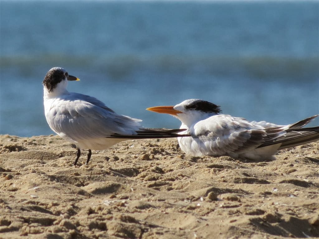 Below two Sandwich Terns and bottom right I believe is the Royal Tern with the orange bill.