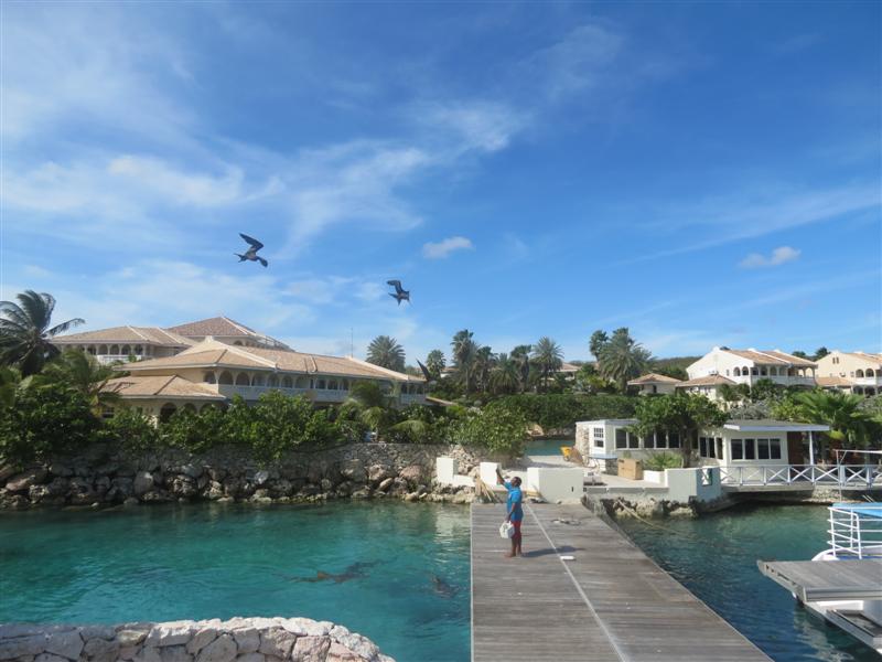 Above, one of the aquarium trainers was feeding the sharks when the frigatebirds flew over his head looking for hand outs. The water is so clear even from a distance you can see the sharks swimming near the trainer.