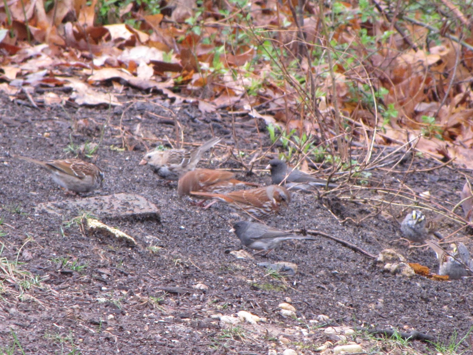Above is a Dark-eyed Junco, White-throated Sparrow and the Fox Sparrow