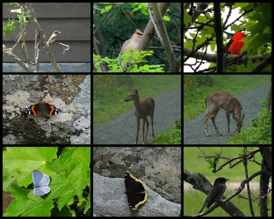 Some of the birds seen, id and pictured in my mosaic are the Cedar Waxwings, Eastern Phoebe, Scarlet Tanger. The deer is one that walked up to us on the Limberlost trail. I am not sure of the Butterflies and the tiny blue moth was beautiful.