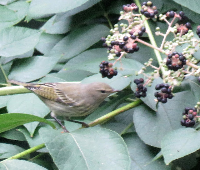I was happy to see the warblers eating berries in my yard thru the beginning of October. One day 9/27 there must have been 12 or more warblers on the berries at one time. I saw the Cape May Warbler and I think the Tennessee Warbler also a Red-eyed Vireo.