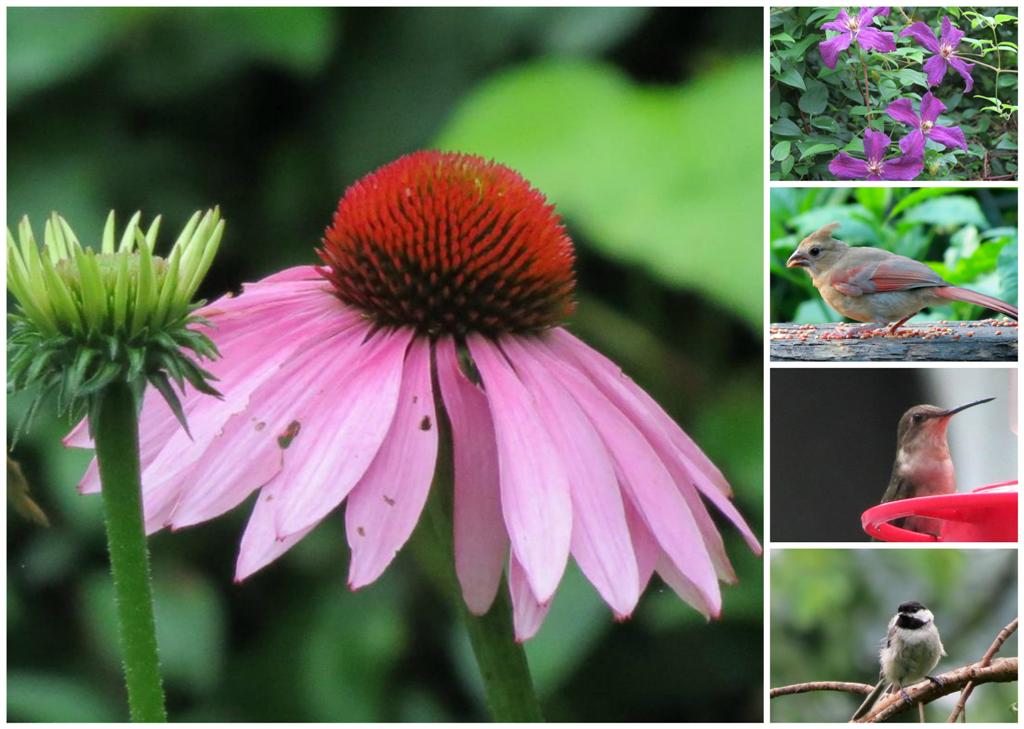 My purple coneflowers are starting to bloom, they are one of my favorite flowers. I also included some clematis still in bloom, a juvenile Cardinal, a Ruby-throated Hummingbird and a Carolina Chickadee.