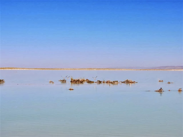 Salt Basin and Linda Lake...a few gulls flying away..the blue water and sky almost meet.