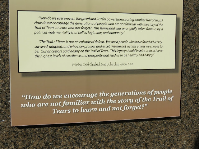 "How do we ever prevent the greed and lust for power from causing another Trail of Tears?" The memorial wall on the left side memorializes the 1835 census of the Cherokee. The map shows the actual trails showing the different routes taken by the Cherokees on their journey west.
