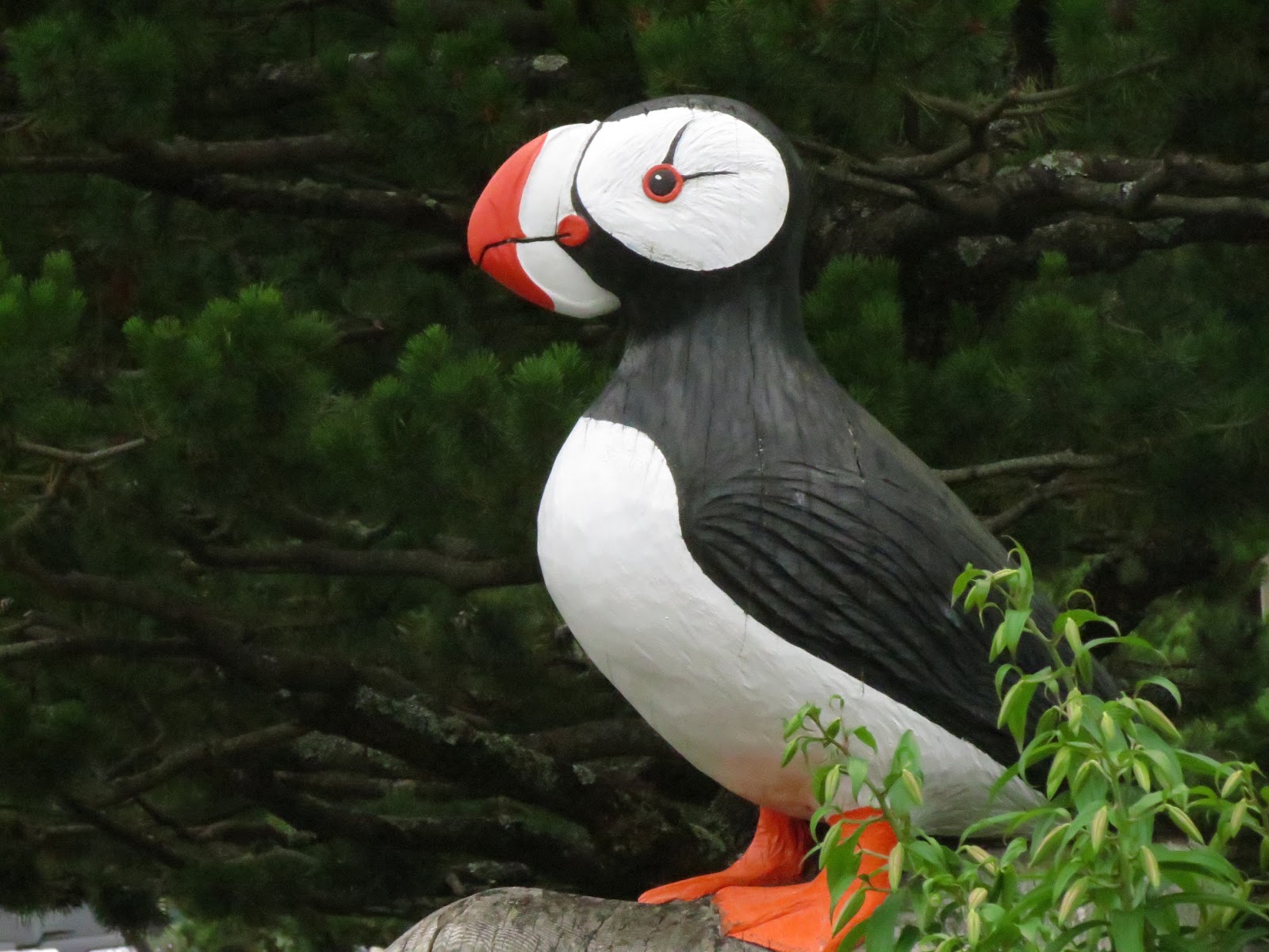 Edit; Sorry, but this Puffin is the town's mascot and is a statue. I did take the photo but it is not a real Puffin. LOL, pretty life-like statue though!  Cannon Beach and Haystack Rock are known to be breeding areas for the Tufted Puffin.
