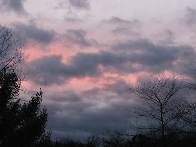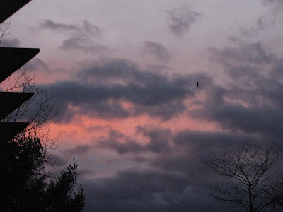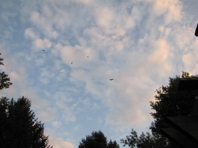 As the time passed the clouds turned a pretty pink and orange color. And I watched the vultures fly into the woods and land on the nearby trees. Once in a while I could hear them flapping them wings.