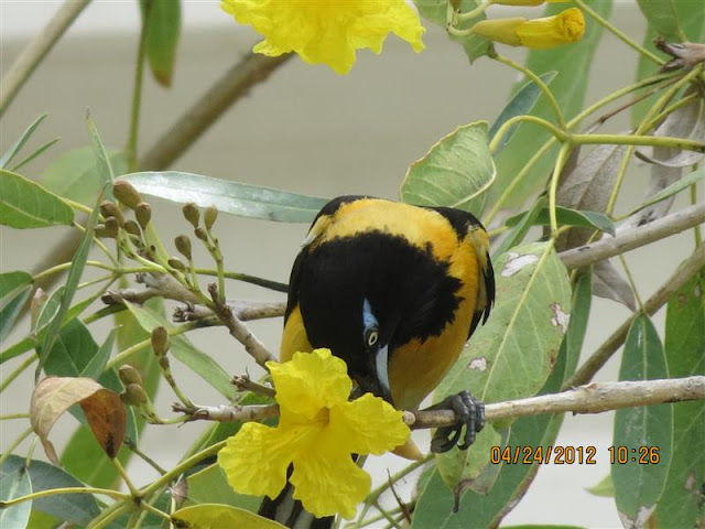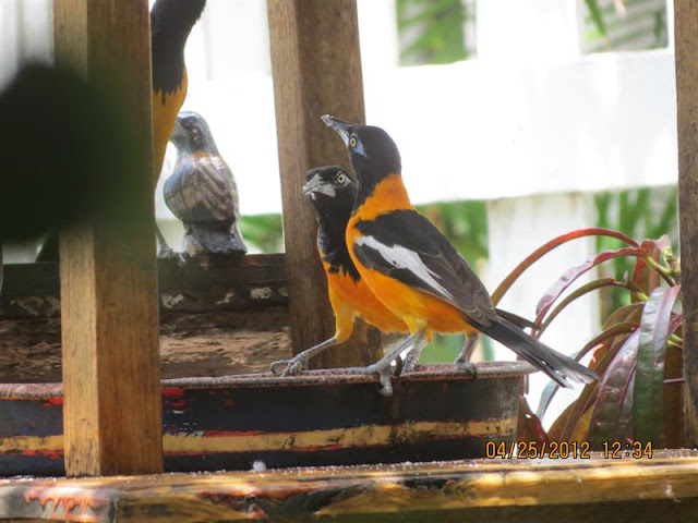 Above, you can see the size of the Troupial compared to the smaller Bananaquit sitting on the feeder.