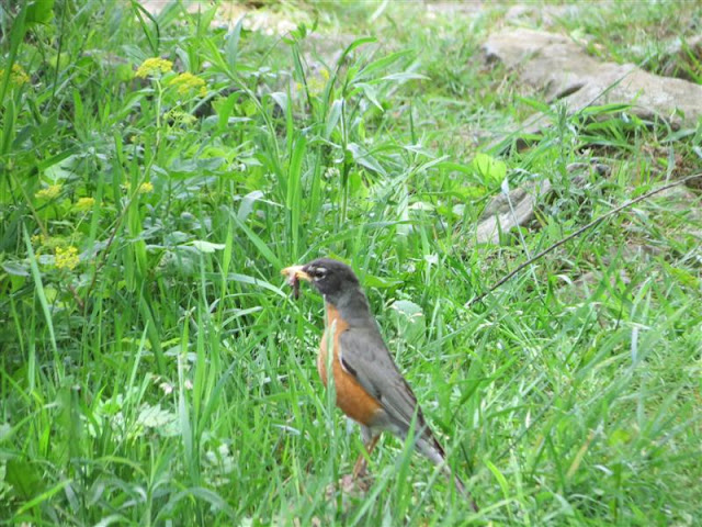 Robin collecting worms and bugs to take back to its nest.
