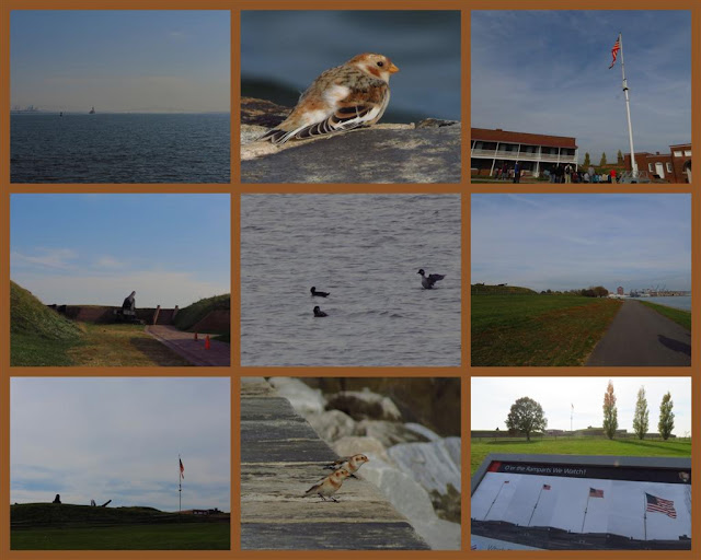 I have been reading recently on my birding listserve that Snow Buntings were being seen at Fort McHenry in Baltimore. I have only seen the Snow Buntings in flight along the Delaware shores so I figured this was my chance to see them on the ground and a little closer. So hubby and I drove to Baltimore picked hubby's cousin and we all went to enjoy the great weather and a walk around Fort McHenry. Well, I am sure everyone knows I am really into birds could not pass up such a great opportunity to see the beautiful Snow Buntings and unbelievably it was hubby's cousins first time inside the Fort. I am happy to report finding these two Snow Buntings was so easy and I have to thank the nice birder that found them and reported seeing them. Seeing the Snow Buntings made my weekend.