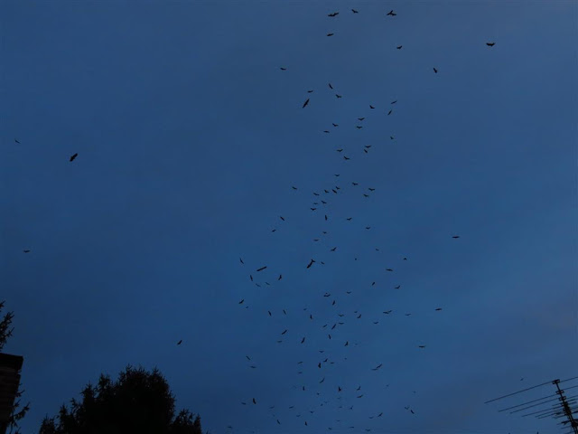 It is Thanksgiving Day and I am spending the day with my hubby, son and family. After serving fifteen for dinner, we should be able to chill and check out my birds and sky. These are some shots taken thru-out this past week. A pretty sunset, a few kinglets from our walk on the fireroad, a couple of Brown Creepers and the vultures making their way back to roost for the night.