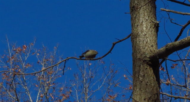 A cropped shot of a Golden-Crowned Kinglet. The sky is a beautiful blue, it was a lovely day for a walk on the fireroad. The Kinglets are quick movers like the warblers, they did not stay still for a second.