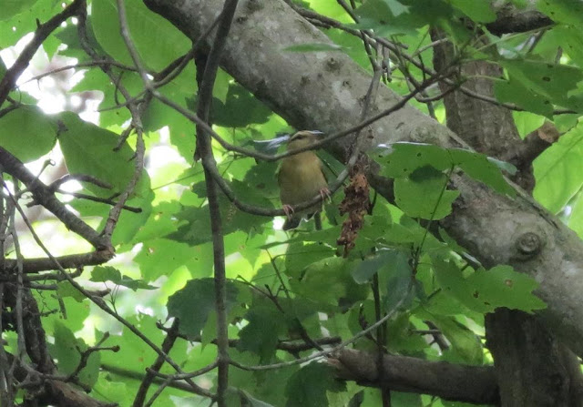 From my fireroad walk, not the best photo but it is the Worm-eating Warbler.  This bird has olive-brown upperparts, light underparts and black and light brown stripes on its head. They can be found breeding on wooded slopes in a deciduous forest. I found this bird on a hilly trail heading down to our lake.