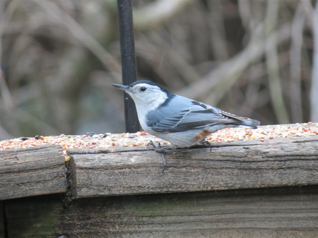 A couple of my yard birds during the storm, the White-breasted Nuthatch and a male Downy Woodpecker.
