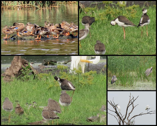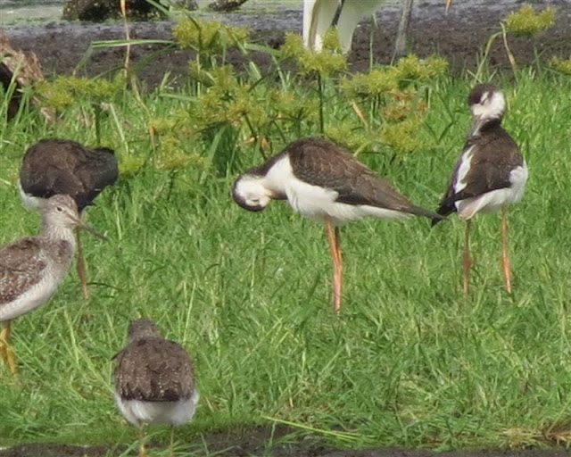 Above my preening birds are ducks, black-necked stilts, stilt and egret, great blue heron and great egrets.