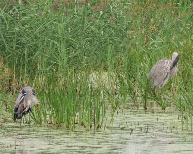 Two Great Blue herons preening.