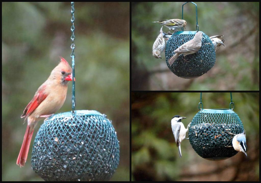 FEBRUARY...A favorite feeder with the birds..seen above a few of my favorites birds...the female Northern Cardinal, Pine Siskins, Carolina Chickadee and a Red-Breasted Nuthatch...