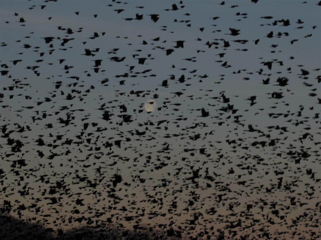 I like this photo with the tree, the large flock of blackbirds and the rolls of hay