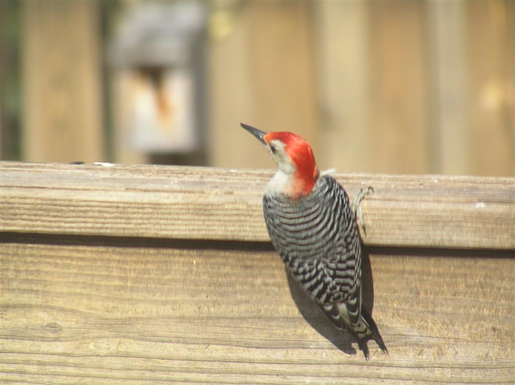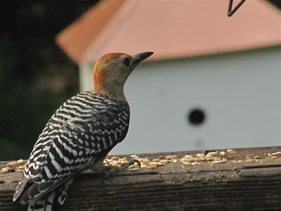 The Redbellied Woodpecker nest in cavitiies in eother dead or live trees. Both the male and female will help dig out the cavity for their nest. They like to eat insects, nuts, fruits and seeds. At my feeders they prefer the suet and the black oiled sunflower seeds. This past week the juveniles were following the adults around and I was able to see this juvie land on my deck and I had a quick view of a juvenile that had no red at all on its head. I believe my Redbellied Woodie couple had two nestlings.. a male and a female. The female may be the juvie I am see with an all white head.