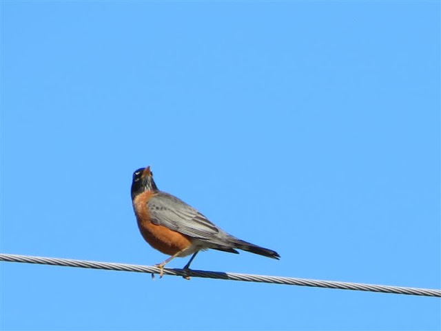 A robin perched on the wires with a pretty blue sky for a background.